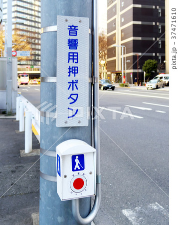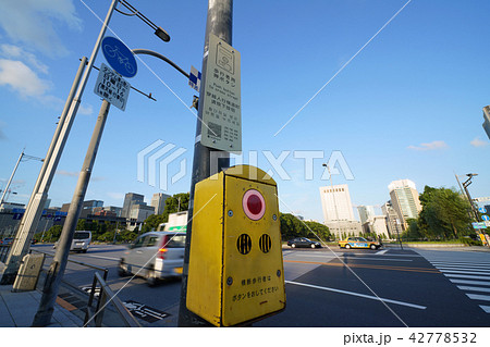 日本の東京都市景観 祝田橋交差点の歩行者用押しボタンや、街並みを望む