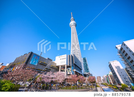 日本の東京都市景観 青空に映える東京スカイツリーと御殿場桜などを望む