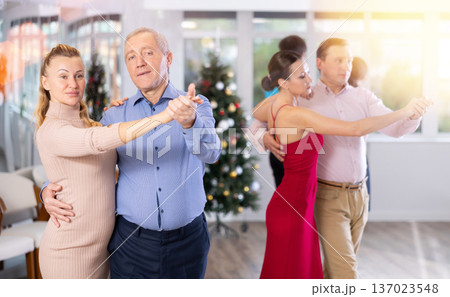 Men and women dancing tango or samba next to Christmas tree