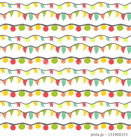 Seamless festive pattern with garlands, colorful flags and hanging ornaments