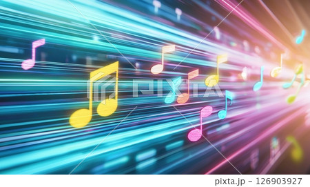 Colorful musical notes with vibrant light trails in background.