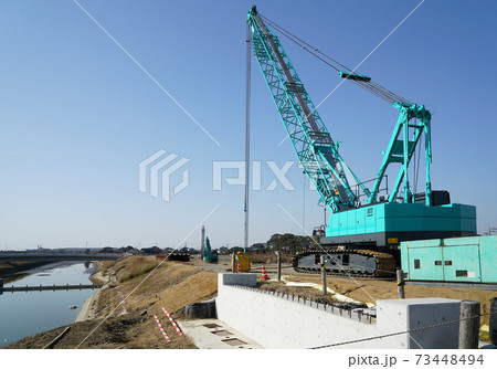 河川工事に使われるクローラクレーン 橋の架け替え工事のクレーン 河川拡張工事中のクレーン