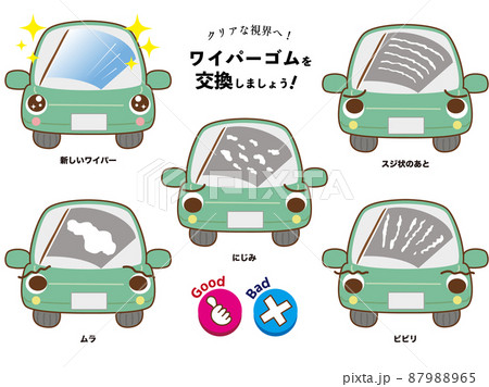 車のワイパーゴムのトラブルときれいなワイパーゴムのイラストセット