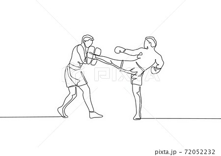 Single continuous line drawing of young sportive man kickboxer exercise with personal trainer in sport hall. Fight competition kickboxing sport concept. Trendy one line draw design vector illustration