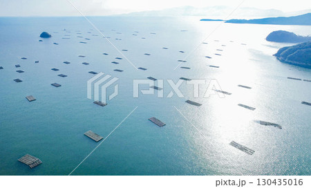 岡山県 瀬戸内海の牡蠣いかだと多島美 漁業風景 ドローン空撮 海の景色