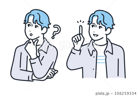 考える表情と笑顔で喜ぶ表情のカジュアルな服装の若い男性のシンプルなベクターイラストセット素材