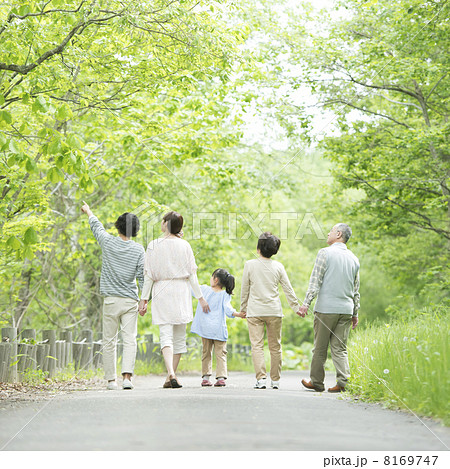 新緑の中で手をつなぐ3世代家族の後姿