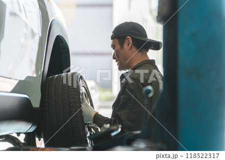 リフトアップした車のタイヤを脱着する整備士の男性(タイヤ交換)