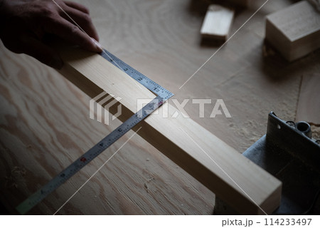 材木に線を引く大工