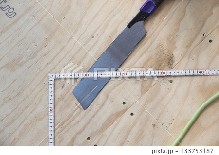 床に置かれたのこぎりと差し金 大工道具