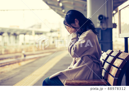 駅のホームで泣く女性 station