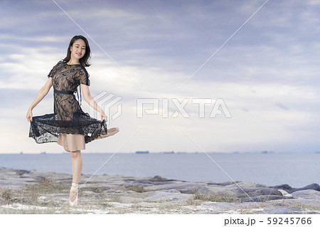 夕暮れの海岸でバレエを踊りインスタ映えする女性