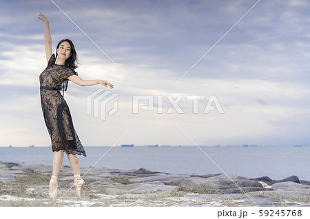 写真映えする夕暮れの海岸でバレエを踊る女性バレエダンサー