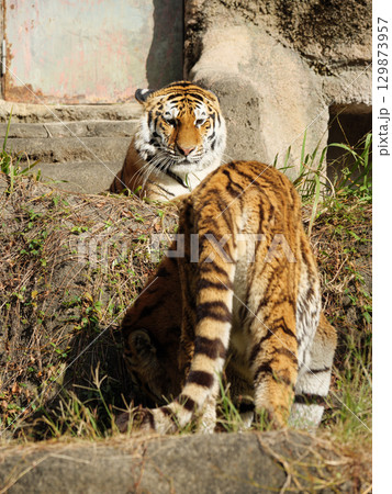 Siberian tiger in the zoo during winter time. Tiger on show.