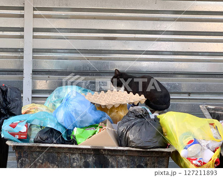 Black homeless cat standing in a dumpster at countryside. Stray kitten looking into camera from trash bin. Problem of protecting animals concept. Close up
