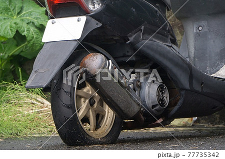 ゴミ置き場、粗大ゴミ、不法投棄されたバイク、廃車になったスクーター,ガラクタになった二輪車