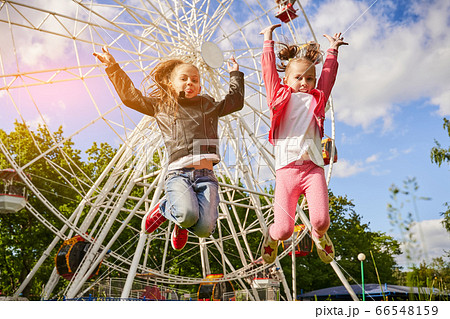 Two Girls Are having fun in amusement park. A Ferris Wheel Are On The Background.