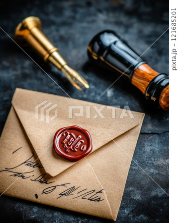 Sealed envelope with wax seal, a letter and sealing wax on a rustic surface