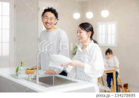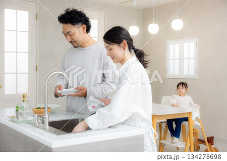 台所でお皿片付けて、家事をする若い男性 家事代行