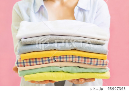 Modern Electric iron and stack of clothes on ironing board on pink background in laundry room. Household laundry ironing Woman holding Stacks of folded washed and dried clothes pile