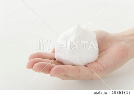 洗顔フォームの泡を持つ女性手元