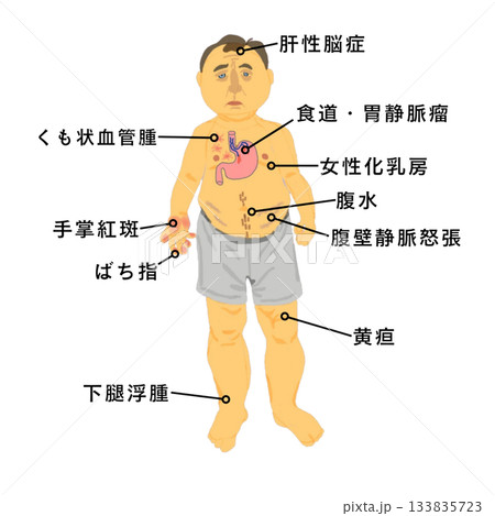 肝硬変の全身症状イラスト|黄疸・腹水・くも状血管腫など看護学生向け医療教材