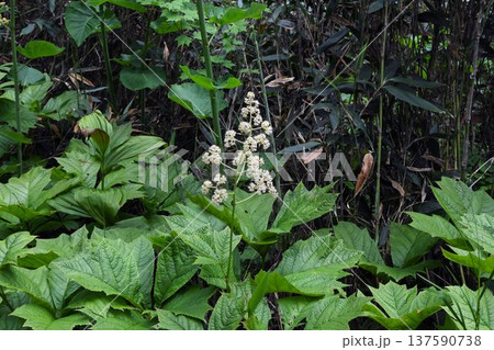 信州栂池自然園で見た掌状複葉の葉からの伸びた花径に咲く白色の花の円錐状の花径が綺麗なヤグルマソウ