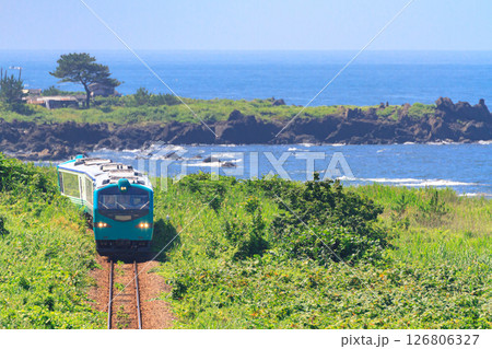 雄大な日本海が広がる詩情あふれる夕景を背景に五能線の気動車が走る