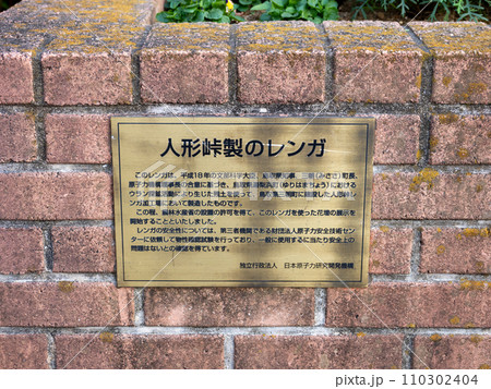 農水省入口前にある花壇 【人形峠製のレンガ】の解説板