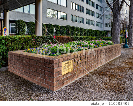 【人形峠製のレンガ】で作られた農水省入口前の花壇と解説板