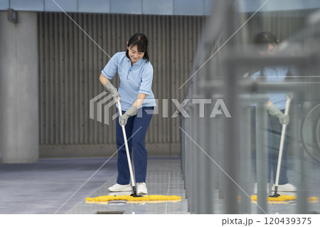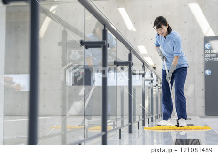 ビル清掃イメージ フロアのモップかけをするミドル女性の清掃スタッフ