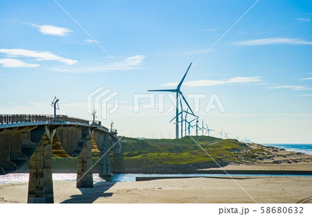 8月静岡県掛川市大浜海岸で朝7時撮影した潮騒橋と風力発電と朝日