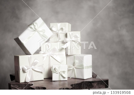White gift boxes with ribbons as a celebration stack. Color of 2026 year dancer in the white cloud