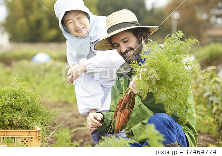 野菜 収穫 農家の女性と外国人男性