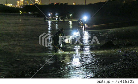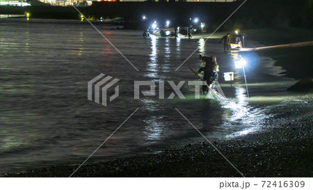 静岡県磐田市の天竜川河口で漁師が照明を頼りに波打ち際を手網ですくうシラスウナギ漁(ニホンウナギの稚魚