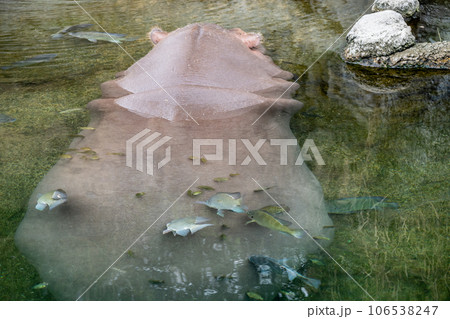 カバの皮膚をつつくナイルティラピア 天王寺動物園 カバ舎