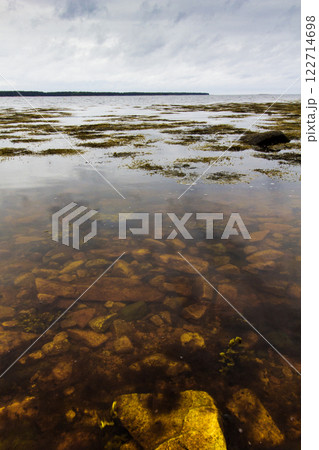 Rocky shoreline with seaweed and ocean waves, sand visible on the beach, mallorca balearic islands, spain