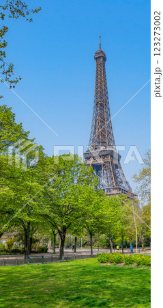 The Eiffel Tower stands majestically against a clear blue sky, surrounded by vibrant green trees in a park. Visitors enjoy the serene atmosphere on a sunny day in Paris.