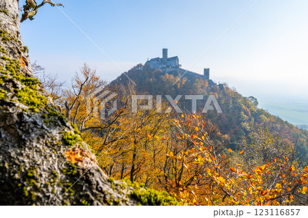 The majestic Bezdez Castle stands prominently on a hill, surrounded by vibrant autumn foliage. This historic Gothic structure showcases its rich heritage against a clear sky.
