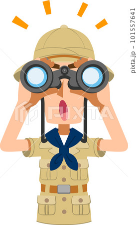 双眼鏡を覗いてなにかを発見する男性探検家の上半身