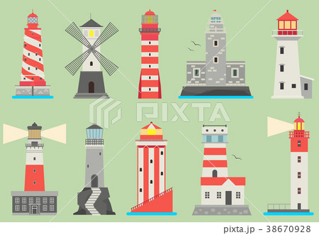 Lighthouses vector flat searchlight towers for maritime navigation guidance ocean beacon light