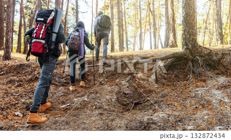 International backpackers walking by autumn pine forest, exploring countryside, back view