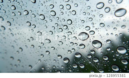 This image is a close up shot of numerous water droplets clinging to a clear surface, possibly glass, with blurred scenery visible through them, giving a sense of