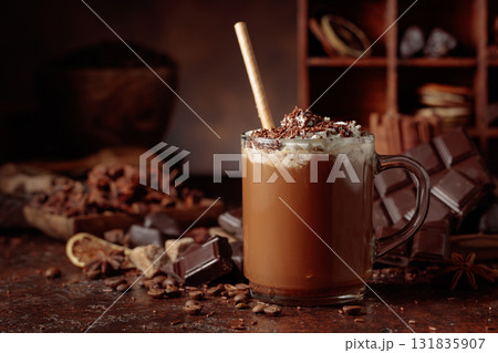 Chocolate drink topped with whipped cream and sprinkled with chocolate chips.