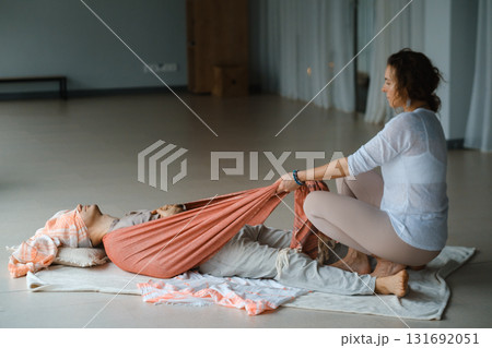 Wellness session for relaxation with guided stretching in a serene studio environment during a calm afternoon