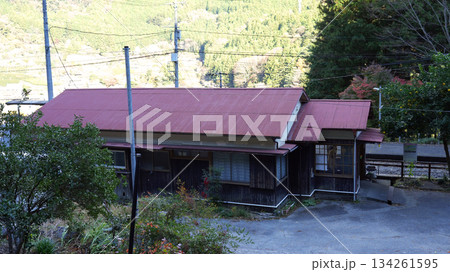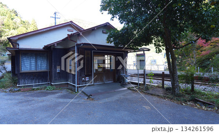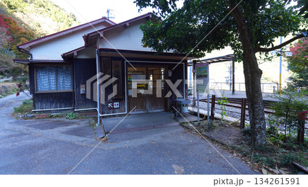 川根本町の秋の接岨峡温泉駅の駅舎とホームの風景(静岡県)