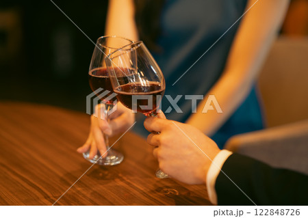 おしゃれなレストランでワイングラスを傾ける男女 顔無し