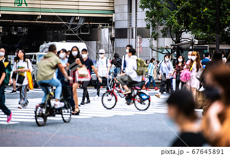 日本の東京都市景観 渋谷のスクランブル交差点の危険運転自転車・マスク姿(奥は渋谷駅方向)