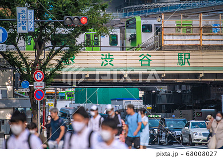 日本の東京都市景観 渋谷スクランブル交差点・マスク姿(奥は渋谷センター街)