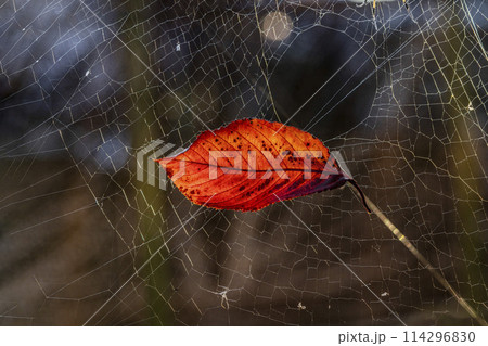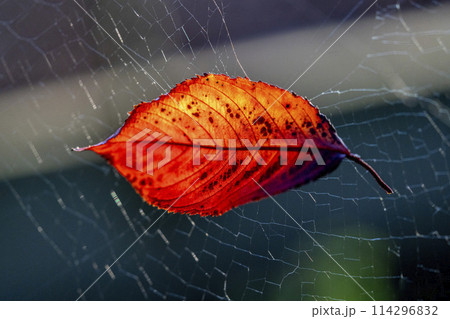 蜘蛛の巣に掴まった赤く紅葉した桜の葉